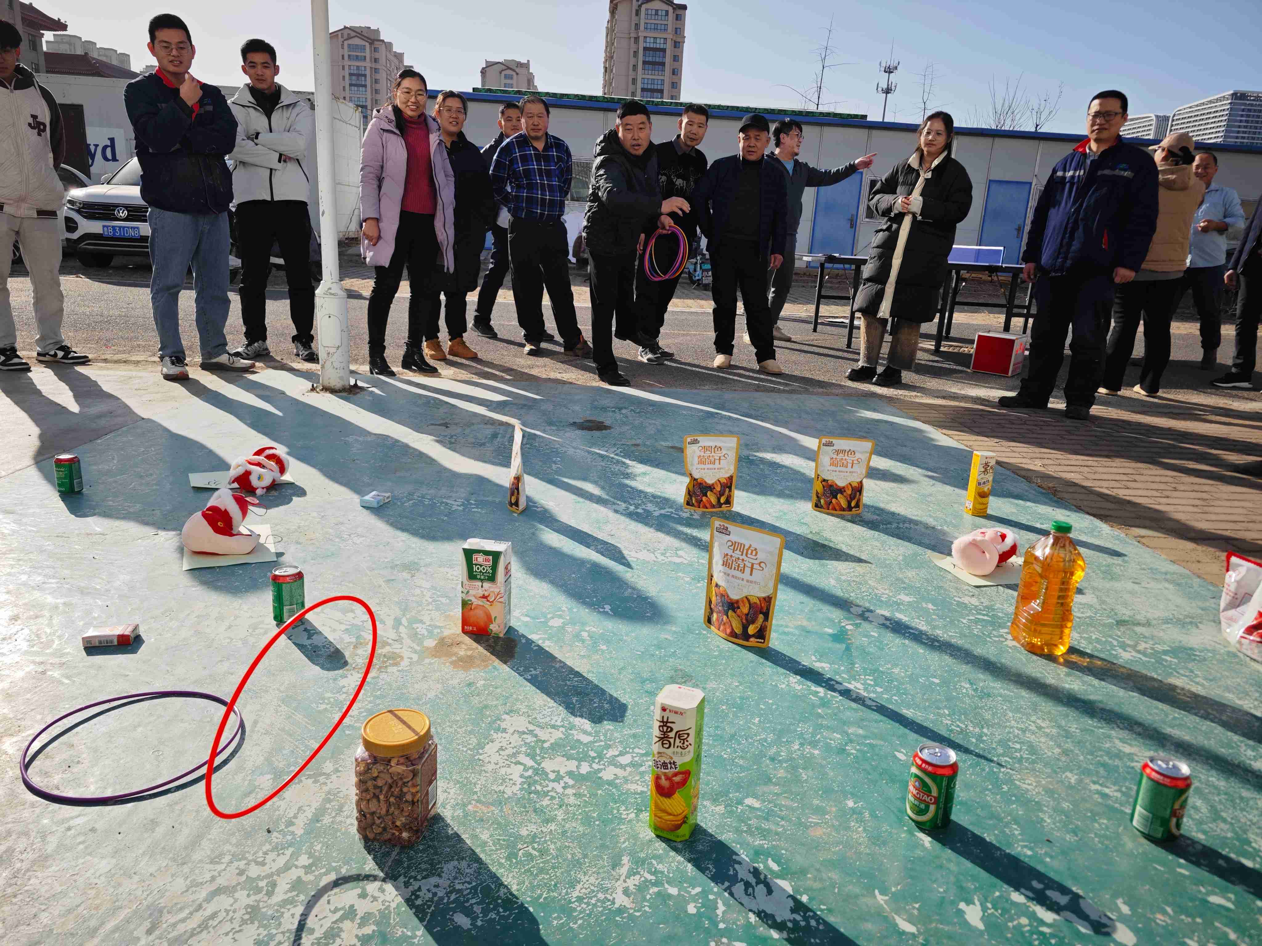这个游戏成功的关键在于力度、角度以及时机的精准把握,这不仅考验着同事们的手眼协调能力,还融入了策略与运气的元素,使得每一次尝试都充满了未知与惊喜,让同事在欢笑中收获了丰厚的零食奖励。